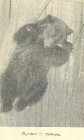 В Театре зверей теперь выступает новый представитель гималайской породы – полугодовалый Шустрик. Имя свое он вполне заслужил: это на редкость сообразительный, быстро усваивающий все уроки звереныш. Попал он в Уголок двухмесячным крошкой; ведь медвежата при рождении весят всего 600–700 граммов. Эта особенность выработалась у медведей в течение многих тысячелетий, не будь ее – они давно бы вымерли. Ведь самки приносят детенышей во время зимней спячки, когда деятельность их организма поддерживается только за счет жира, накопленного летом. Если бы медвежата рождались крупными, самка не смогла бы выкормить свое потомство.