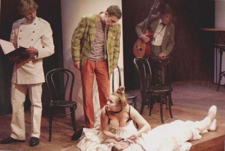 Тут правит бал не социальный пафос, а всепроникающая театральность – то повеет кафешантаном, то гофманианой, то театром абсурда, то словно смотришь фильмы Марселя Карне. Социальное происхождение героев в этом представлении куда менее важно, чем правильно подобранный артистом костюм или умение грассировать и шепелявить. Помните, как в спектакле «Волки и овцы»