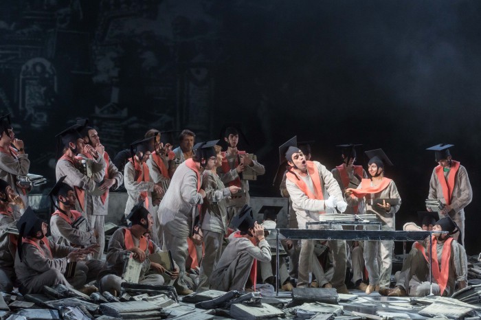 Постановка оперы «Осуждение Фауста», которой не было в России 169 лет, то есть никогда, необъяснимым образом состоялась сразу в двух театрах за сезон. Причем Астрахань на несколько месяцев опередила Главный, так что честь российской премьеры останется на ее счету. Ключ к пониманию этого спектакля в том, что «Осуждение» – не совсем опера, по крайней мере, в системе координат XIX века. Это вокально-инструментальное полотно, которое состоит из протяженных звуковых массивов, скорее погружающих в мир гетевской трагедии, чем дающих ответы на вопросы, кто кого любил, почему погиб и когда взял верхнюю ноту. Режиссер Константин Балакин почувствовал «неформатность» материала и выразил ее в сценическом парадоксе. С одной стороны – новые театральные и визуальные технологии, которые лучше один раз увидеть. С другой – предельная статичность: хор, миманс и балет (вместе –главное действующее лицо спектакля) в каждой сцене монотонно повторяют простые действия, незаметно затягивая нас в состояние рефлексии либо медитации – кому что дано. Балакин поставил «Осуждение Фауста» так, как принято ставить оперы композиторов-минималистов, и тем самым неожиданно вскрыл важный, если не ключевой, пласт драматургии Берлиоза.