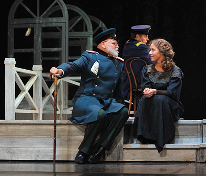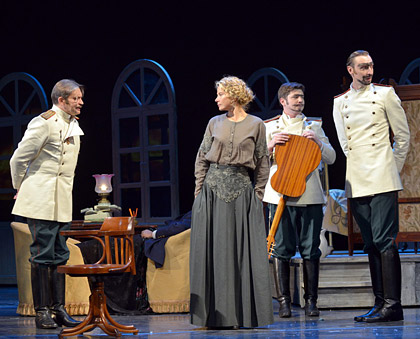 Спектакль «Три сестры» в театре Моссовета – постановка, созданная блестящей командой: режиссером Андреем Кончаловским и актерами – Александром Домогаровым, Юлией Высоцкой, Ларисой Кузнецовой, Натальей Вдовиной и другими, не менее известными артистами. В своей работе постановщик постарался проявить на сцене актуальность и современность пьес Чехова. Не случайно игра актеров сопровождается трансляцией на экране кадров хроники и интервью артистов, в которых они рассуждают о роли Чехова в их жизни. Стоит заказать билеты на спектакль «Три сестры» в театр Моссовета, чтобы получить возможность по-новому взглянуть на известных персонажей романа Чехова, пережить с ними их трагедии и почувствовать контраст между прошлым и сегодняшним временем. Заказ билетов можно сделать на сайте компании «Билетторг» в режиме онлайн или по телефону +7(495)363-13-36. В разное время пьесу «Три сестры» ставили немало режиссеров. В их числе – О. Ефремов, Г. Товстоногов, Вл. Немирович-Данченко, Ю. Любимов. А теперь у всех зрителей, которые купят билеты на спектакль «Три сестры» в театр Моссовета, есть возможность оценить еще одну работу – не менее гениального режиссера Андрея Кончаловского, которого знают не только театралы, но и любители кино. Историю сестер он показал как тонко выстроенную драматическую симфонию. Сделать заказ билетов на эту постановку стоит еще и потому, что в ней задействован блестящий состав актеров-исполнителей, которые делают стильный и изящный спектакль еще более интересным и насыщенным.
