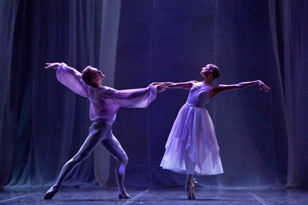 О чувствах героев зрители догадываются только мимоходом — по случайным взглядам, жестам, мимолетным объятиям, почти бесшумному шепоту и скромно потупленным взорам. Балет «Призрачный бал» - это, прежде всего, изящный классический танцевальный рисунок, мастерски сотканный профессиональным хореографом. Но классический танец при этом органично сочетается с виртуозными поддержками, движениями и ритмикой современного балета. Балет поставлен Дмитрием Брянцевым на музыку великого Шопена. Здесь нет сюжета как такового. Это коктейль из элегантных миниатюр и стилей, над которыми царит и главенствует томный романизм. В единое целое слиты пять логически завершенных дуэтов. Зрители наслаждаются струящимися линиями танца, медлительными, воздушными пареньями, гравюрными позами профессиональных артистов. Пластика балета наполнена богатым диапазоном настроений, меняющихся от спокойствия, безмятежности и созерцательности — до сильных, эмоциональных, широких движений тела и души.